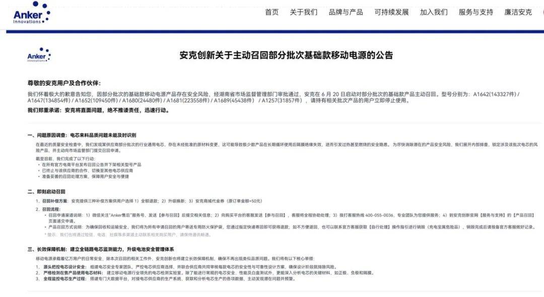 6月20日,安克创新发布关于主动召回部分批次基础款移动电源的公告。公告称,因部分批次的基础款移动电源产品存在安全风险,经湖南省市场监督管理部门审批通过,6月20日,安克在启动对部分批次的基础款产品主动召回。型号分别为:A1642(143327件)/A1647(134854件)/A1652(109450件)/A1680(24480件)/A1681(223558件)/A1689(45438件)/A1257(31857件),请持有相关批次产品的用户立即停止使用。