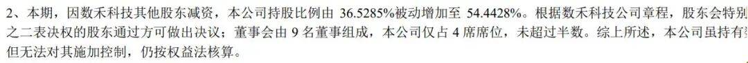 综上所述,本公司虽持有数禾科技 54.4428%的股权,但无法对其施加控制,仍按权益法核算。