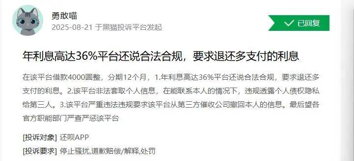 8月21日,一借款人在黑猫投诉平台上发起投诉称,在还呗借款4000元,分期12个月,利率高达36%。