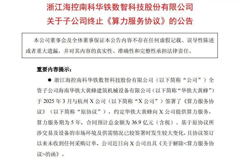 9月30日晚间,海南华铁发布公告显示,公司全资子公司海南华铁大黄蜂建筑机械设备有限公司(以下简称“华铁大黄蜂”)于2025年3月与杭州X公司(以下简称“X公司”)签署了《算力服务协议》(以下简称“原协议”),约定华铁大黄蜂向X公司提供算力服务,算力服务期为5年,合同预计总金额为36.9亿元(含税)。基于原协议所涉交易及设备的市场环境及供需情况已较签署时发生较大变化,且协议签订以来未收到任何采购订单,公司近日向X公司出具《关于解除<算力服务协议>的函》。