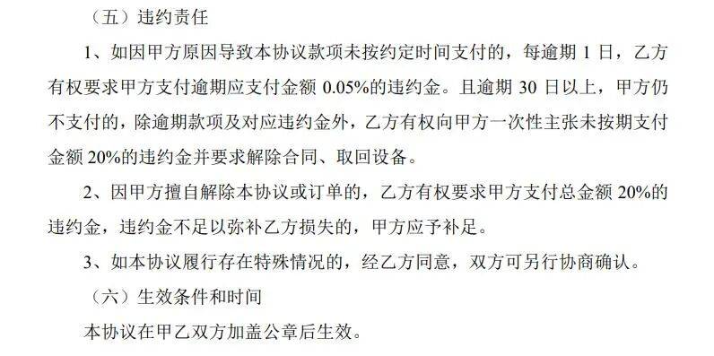 《算力服务协议》中的违约责任条款包含三条,其一是,如因甲方原因导致本协议款项未按约定时间支付的,每逾期1日,乙方有权要求甲方支付逾期应支付金额0.05%的违约金。且逾期30日以上,甲方仍不支付的,除逾期款项及对应违约金外,乙方有权向甲方一次性主张未按期支付金额20%的违约金并要求解除合同、取回设备。