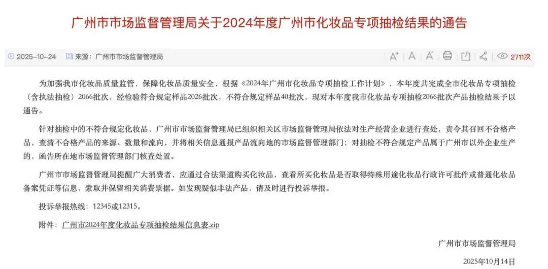 据此前媒体报道,广州市市场监督管理局在“关于2024年度广州市化妆品专项抽检结果的通告”中表示,本年度共完成广州市化妆品专项抽检(含执法抽检)2066批次,经检验符合规定样品2026批次,不符合规定样品40批次。