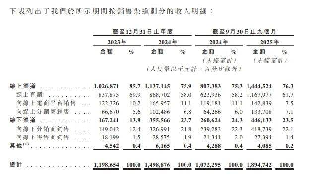 招股书显示,2023年线上收入占比高达85.7%,尽管公司近年大力拓展线下渠道,至2025年前9个月线上收入占比仍达76.3%,天猫、抖音、京东等第三方平台贡献了绝大部分营收。