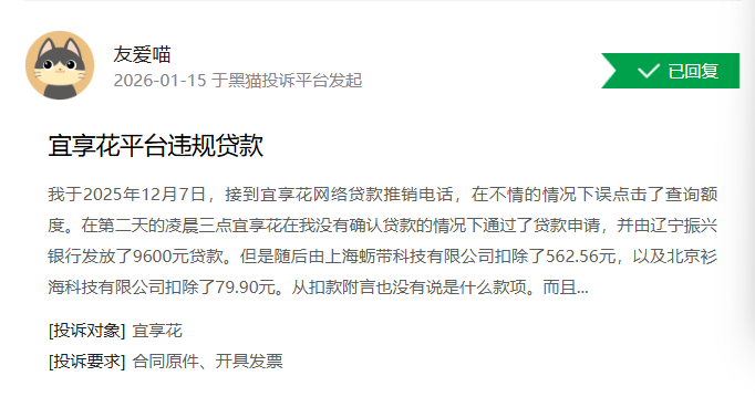 1月15日,一名用户反映,2025年12月7日,其接到宜享花网络贷款推销电话,误点击了查询额度。在第二天凌晨三点,宜享花在没有确认贷款的情况下通过了贷款申请,并由辽宁振兴银行发放了9600元贷款。随后由上海蛎带科技有限公司扣除了562.56元,以及北京衫海科技有限公司扣除了79.90元。扣款附言也没有说是什么款项。