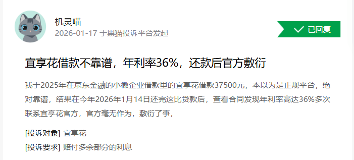 在黑猫投诉平台上,1月17日,一名用户反映,2025年在京东金融的小微企业借款里的宜享花借款37500元,本以为是正规平台,绝对靠谱,结果在2026年1月14日还完这笔贷款后,查看合同,发现年利率高达36%,多次联系宜享花官方未果。