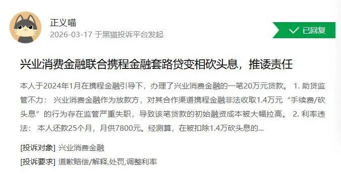 3月17日,有借款人投诉兴业消金称,在携程金融引导下,办理兴业消金的一笔20万元贷款。兴业消金对助贷监管不力。 兴业消金作为放款方,对其合作渠道携程金融非法收取1.4万元“手续费/砍头息”的行为存在监管严重失职,导致该笔贷款的初始融资成本被大幅拉高。