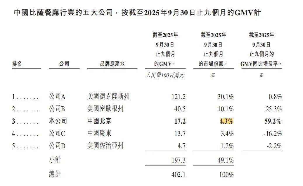 据招股书及灼识咨询数据,截至2025年9月30日,中国自助餐厅行业五大公司的市场份额仅为4.4%,市场集中度极低,竞争异常分散。即便比格按GMV计在中国自助餐厅行业排名第一,但市场份额仅为1.2%。