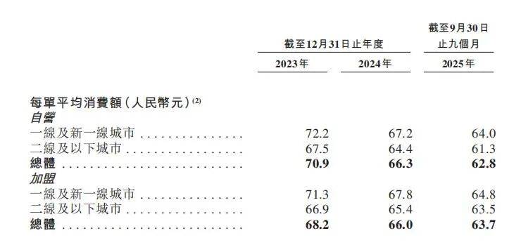 招股书显示,2023年至2025年前三季度,比格自营店每单平均消费额从70.9元降至62.8元,降幅达11.42%;加盟店从68.2元降至63.7元,降幅也有6.6%。