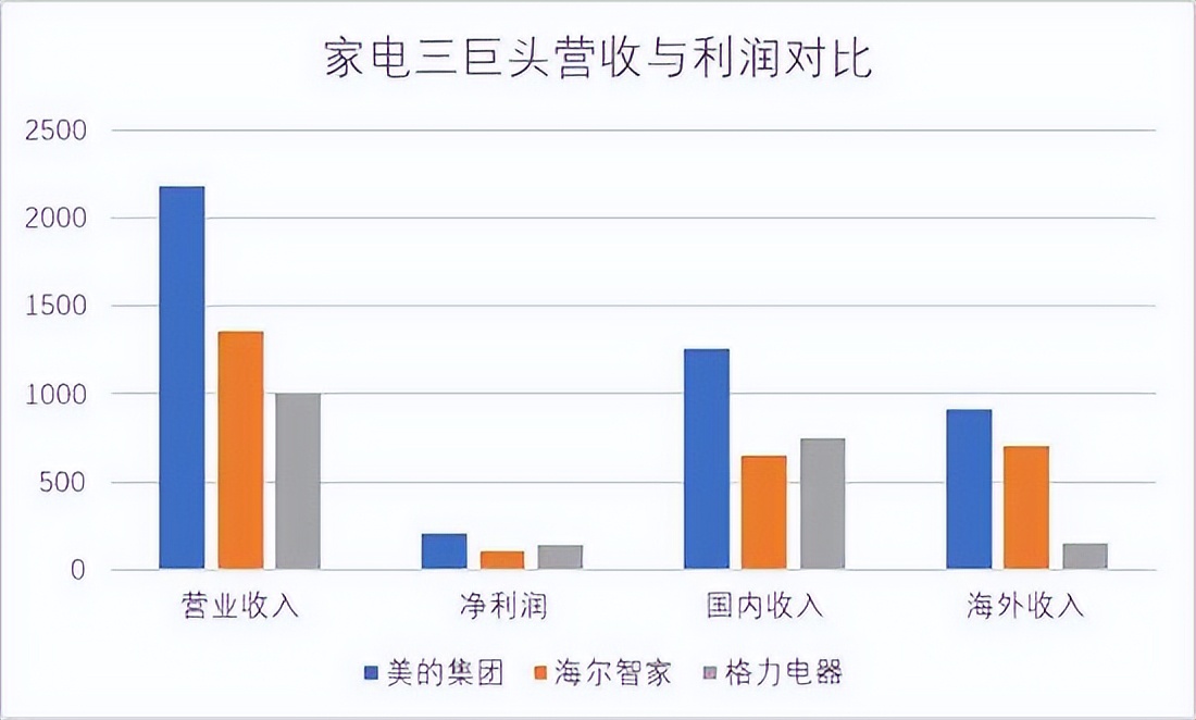 在这种情况下,执着于国内市场“内卷”,显然不是性价比最高的选择。因此,三大家电巨头不约而同将目光瞄向了海外市场。其中,海尔智家出海最早,目前已经在上海、中国香港、法兰克福“A+H+D”三地上市。而美的、格力则紧随其后,规模较小。