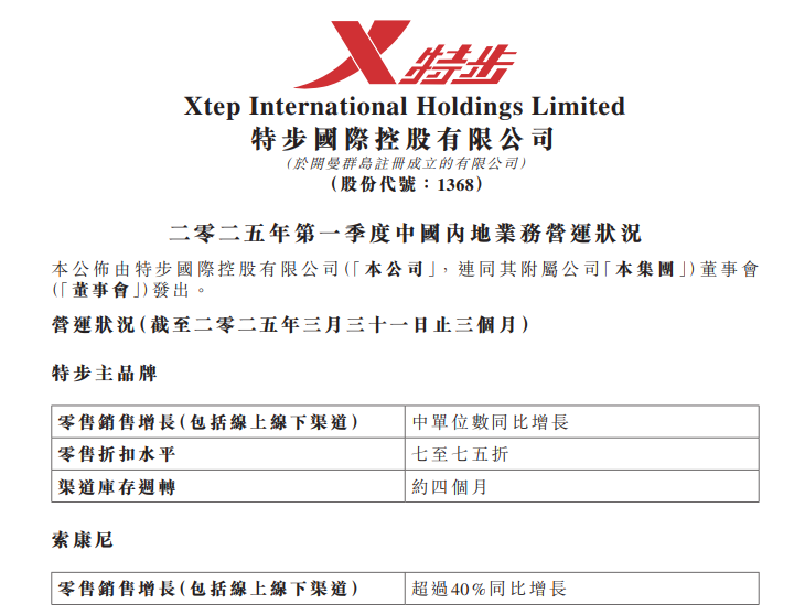 继去年取得可圈可点的业绩后,日前特步国际公布2025Q1中国内地业务营运状况:特步主品牌零售销售稳步增长,渠道库存周转约四个月;索康尼则继续担起增长重任,零售销售增超40%。