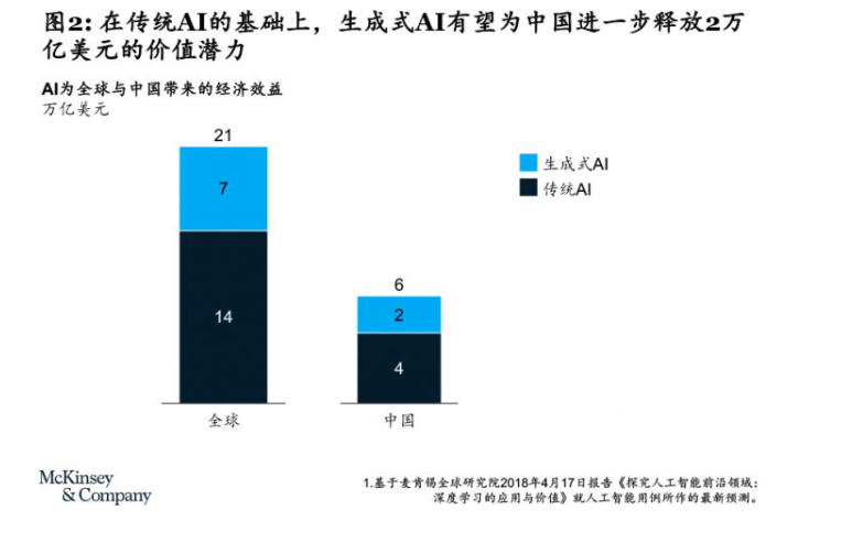 长期而言,AI对通信行业的拉动空间广阔。据麦肯锡报告,生成式AI有望为全球经济贡献约7万亿美元价值,并将AI整体经济效益提升约50%。其中,中国作为AI研发高地,预计将贡献约2万亿美元,接近全球总量的三分之一。