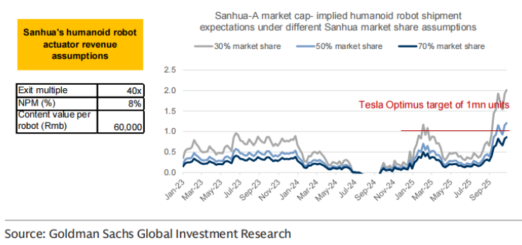 短期内的市场预期已发出警示信号。比如,高盛近期下调了“特斯拉机器人概念”三花智控的投资评级,认为当前股价已隐含了对人形机器人出货量的过度乐观预期。