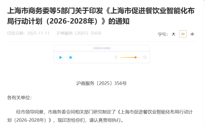 政策层面,北京、深圳对智慧餐饮设备给予15%-20%购置补贴;上海明确提出2028年正餐企业关键环节智能化应用率需突破50%,供应链管理覆盖率超60%的目标。