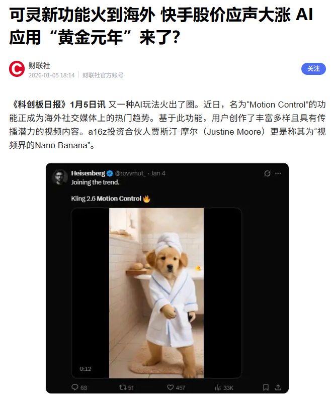 在距离去年10月高点回撤近25%之后,快手股价于1月初放量上行,连续两日高开,1月5日盘中涨幅一度超过13%。几乎在同一时间,快手可灵(Kling AI)最新推出的“Motion Control”功能在海外快速走红,产品侧与交易侧出现少见的同步加速。
