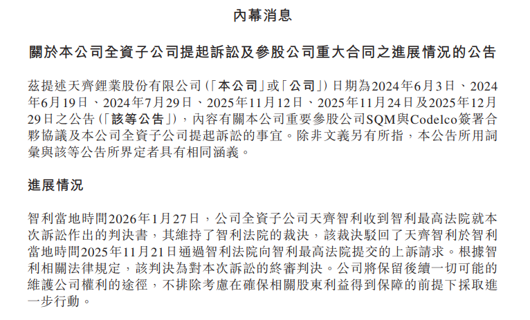 就在此前几天,两家公司先后发布了2025年年度业绩预盈公告,宣告逆周期豪赌的丰收。然而,伴随扭亏为盈的消息传来的,是一纸败诉的冲击。天齐锂业就SQM与智利国家铜业公司战略合作提起的诉讼,以被驳回告终。
