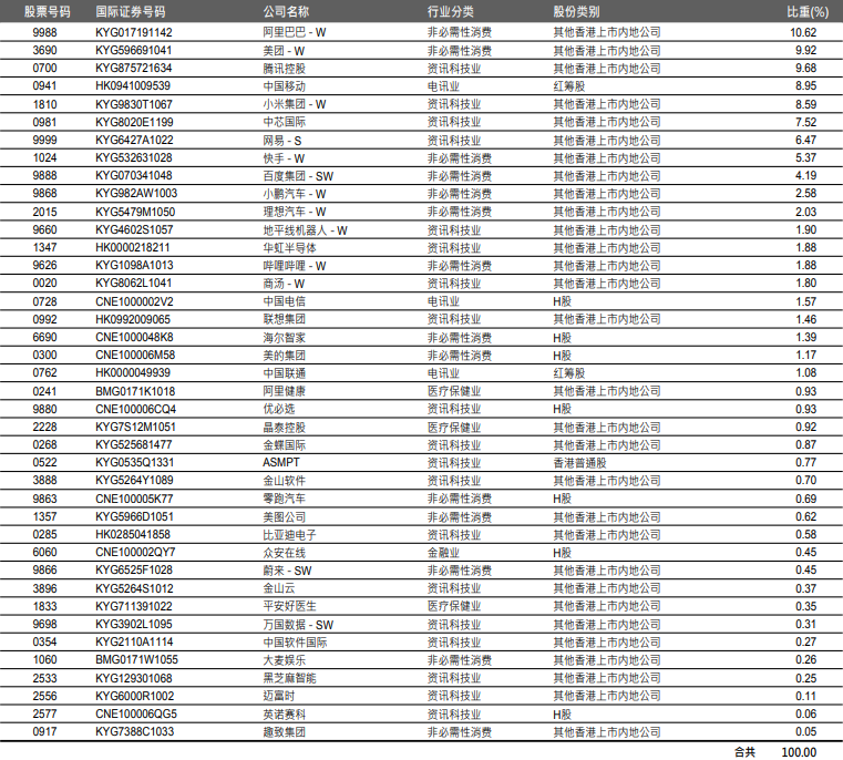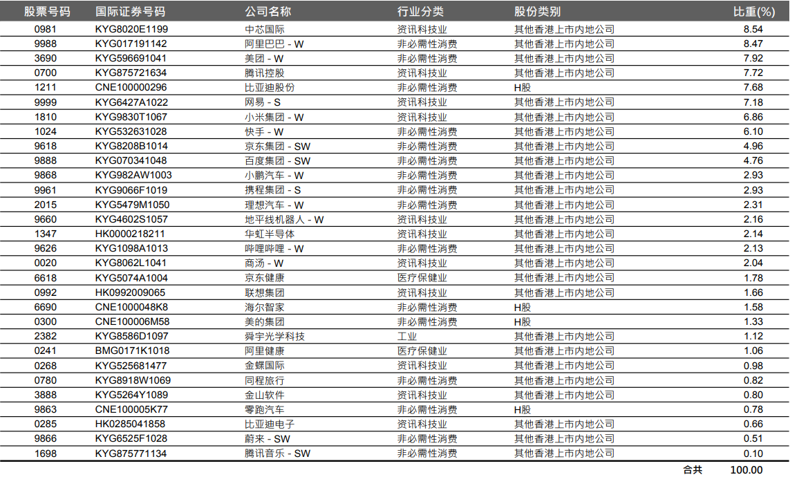 目前,恒生科技指数前十大权重股分别是中芯国际、阿里巴巴、美团、腾讯控股、比亚迪股份、网易、小米集团、快手、京东集团、百度集团,合计占比超70%。