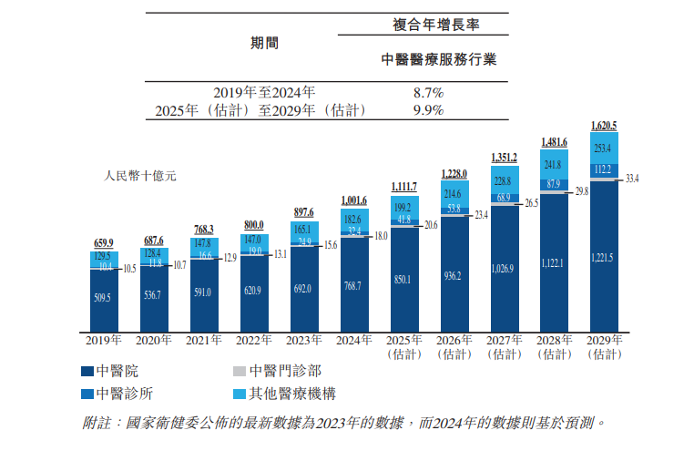 根据弗若斯特沙利文的统计,中国中医医疗服务市场规模2024年已突破万亿元,预计到2029年将增长至1.62万亿元,复合年增长率达9.9%。这一增速不仅高于整体医疗服务行业,更展现出强劲的结构性增长动能。