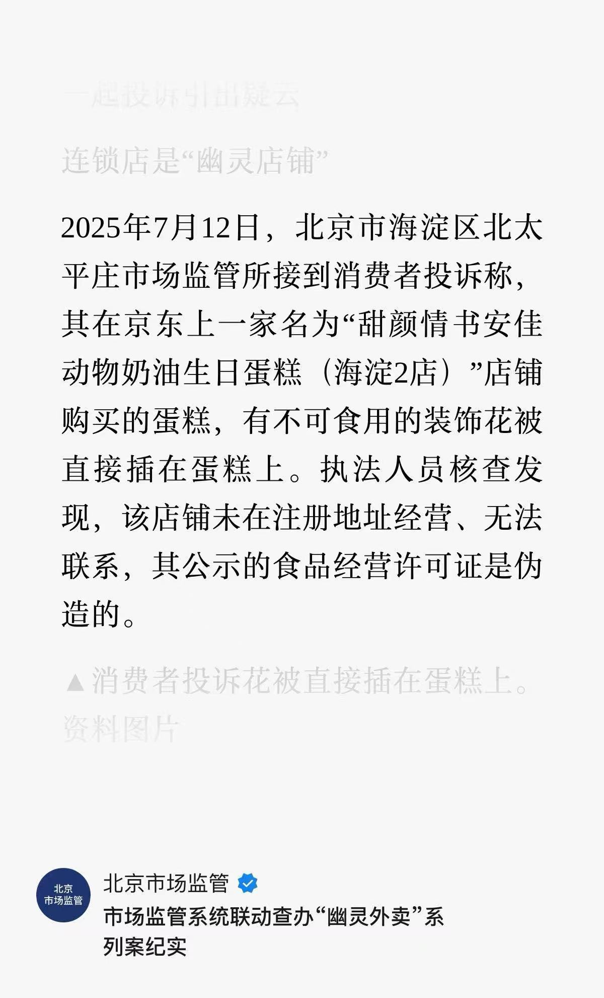 但是,刘先生发现自己收到的蛋糕上,竟然插了几朵真正的不可食用的鲜花,于是直接向市场监管部门进行了投诉。