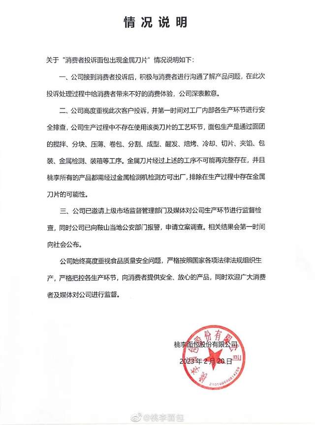 2月20日,桃李面包通过微博回应称,排除了面包生产过程中产生刀片的可能性。
