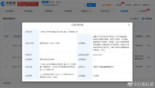2022年7月份,桃李面包全资子公司天津桃李食品有限公司收到了天津市市场监督管理委员会的处罚,处罚事由为: