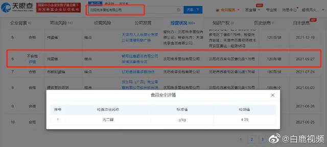 天眼查显示,2021年9月,桃李面包生产的纯蛋糕因丙二醇含量超标被判定不合格。
