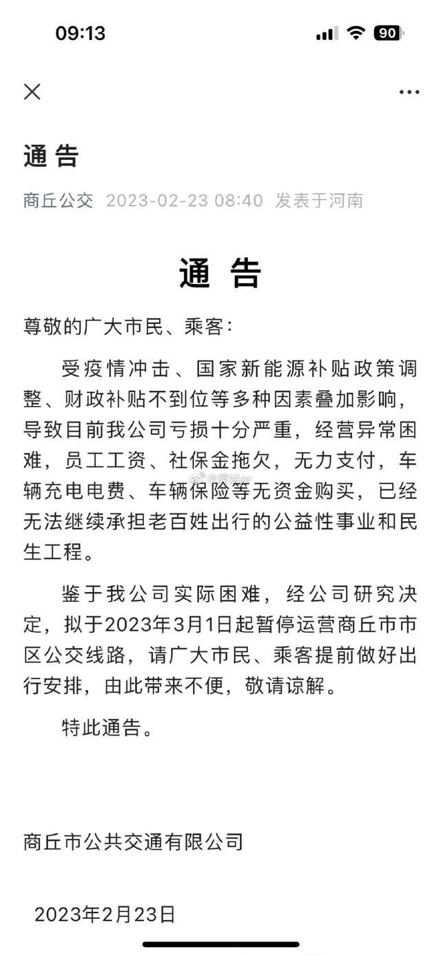 事情是这样的,2月23日早间,商丘公交在微信公众号发布了一则”停运公告”: