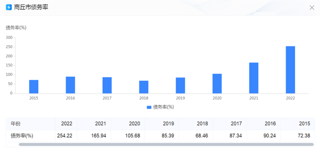 2022年,商丘市的债务率达到了254.22%,连年攀升。若加上政府隐形债务计算,2022年商丘市口径债务率达到了482.52%。