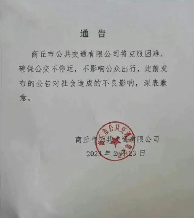 结果不到四个小时,事情便有了反转,商丘市公交公司便发布公告称:公司将克服困难,确保公交不停运,一边还郑重道歉。