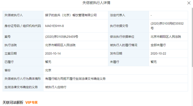 可惜好景不长。2020年10月,猴子的救兵成为失信被执行人。