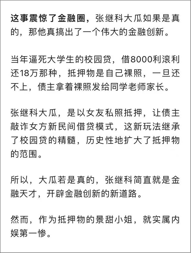 张继科以女友私照抵押,让债主敲诈女方新民间借贷模式,继承了校园贷的精髓,历史性地扩大了抵押物的范围。张继科简直就是‘金融天才’,开辟金融创新的新道路。然而,作为抵押物的景甜小姐,实属内娱第一惨。”