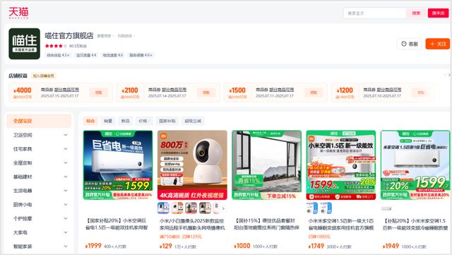 映入眼帘的是清一色标注绿色“喵住”标的商品,从家电到家装,覆盖整屋需求。