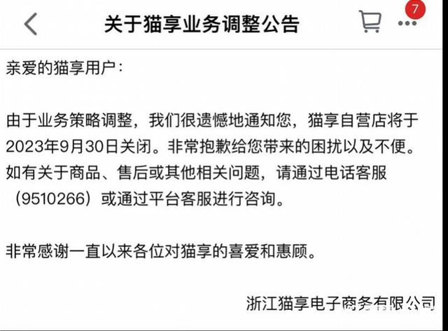 但仅1年半时间,2023年8月1日,“猫享”便发布调整公告,宣布将于9月30日关闭。