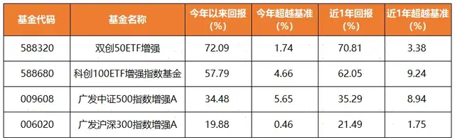 在指数增强方面,广发基金已布局多只产品,跟踪标的指数包括沪深300、中证500、中证A500、中证800、创业板指、科创创业50、科创板100等,为投资者提供多样化选择。