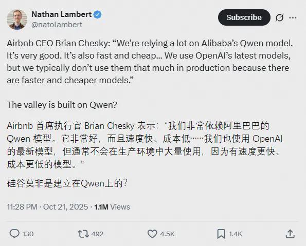在硅谷,Qwen引发的“千问恐慌”早已蔓延。爱彼迎CEO已公开表示公司“大量使用Qwen”,英伟达CEO也强调Qwen已占据全球开源模型的主要份额。