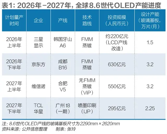 面对OLED高世代线的竞争升级,中国企业不甘示弱,总投资630亿元的京东方成都8.6代线预计在2026年下半年量产,总投资550亿元的维信诺合肥8.6代线预计在2027年上半年量产,总投资295亿元的TCL华星广州8.6代线预计在2027年四季度量产。