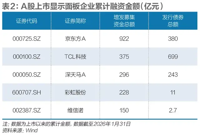 京东方、TCL科技和深天马这三大显示面板上市企业,在二级市场定增和发行债券的募资规模分别累计达到约1302亿元、1074亿元和539亿元,多用于补充产线建设资金;此外,产业投资基金在多个重大项目中提供了关键补充。