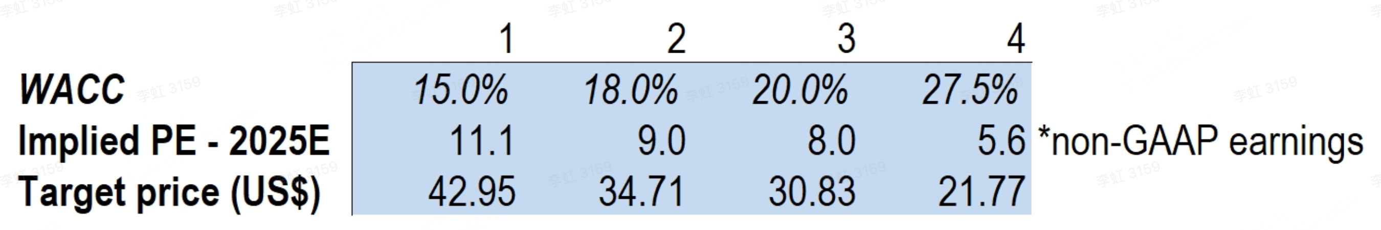 花旗用DCF模型给出21.8美元的目标价,对应2025年市盈率约5倍。但我注意到一个细节:模型采用的加权平均资本成本高达27.5%,远高于行业常规的10%—15%。如果把这个参数调整到更合理的区间,理论估值可以提升到40美元级别。