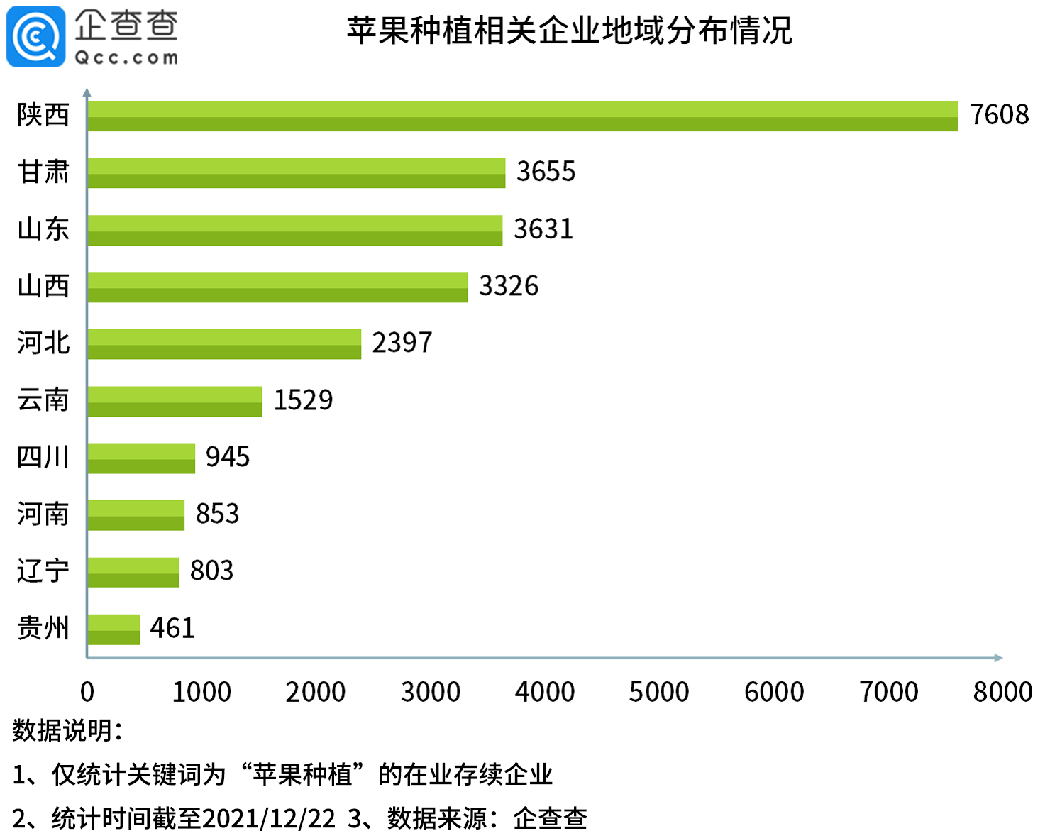从地域分布上看,企查查数据显示,陕西省拥有的苹果种植相关的企业数量最多,达7608家,占全国总量的28%。甘肃省紧随其后,拥有3655家相关企业。山东省、山西省以及河北省分别以3631家、3326家和2397家分列第三至五位。