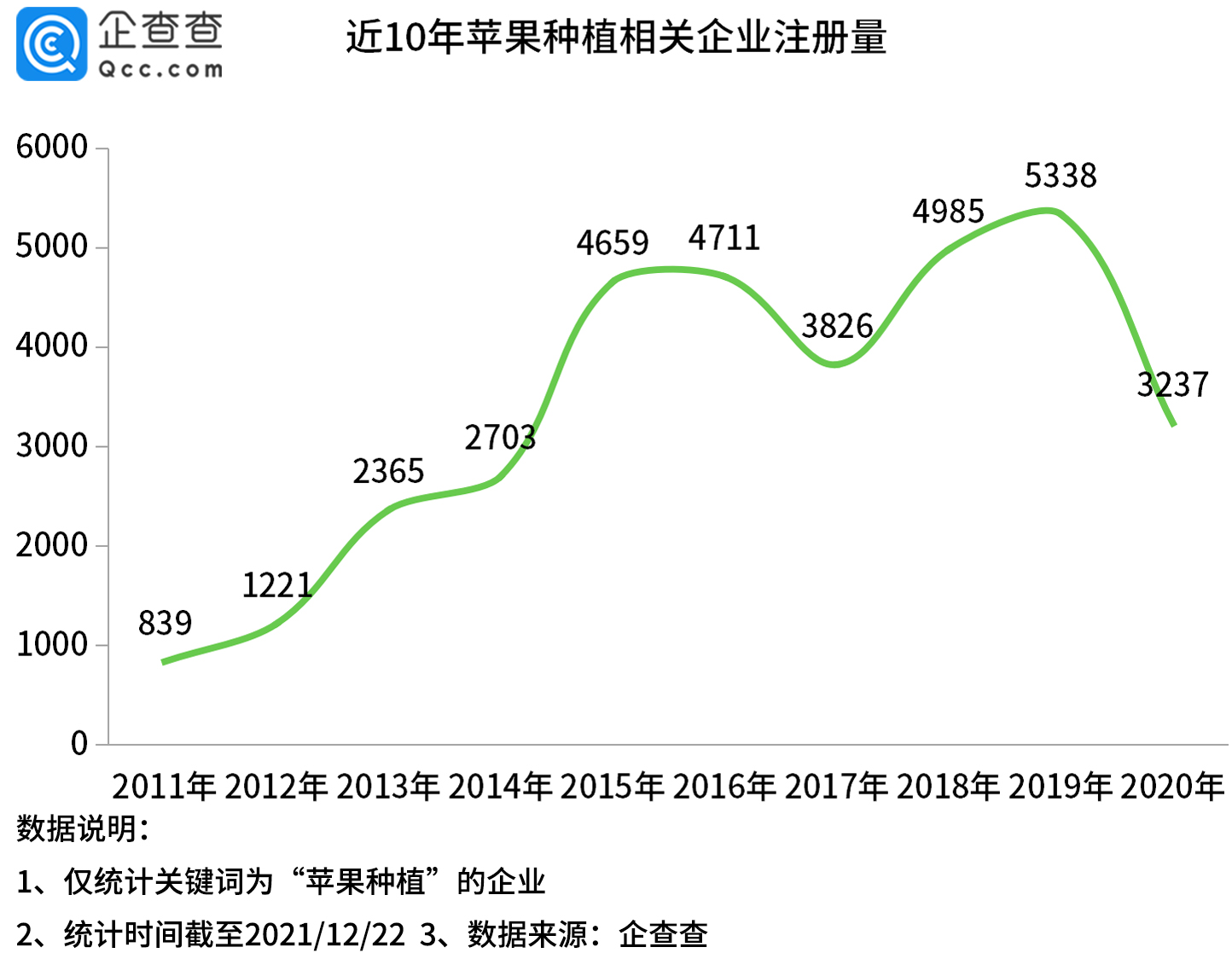 企查查数据显示,近10年我国苹果种植相关企业注册量总体呈波动下降趋势,2013年注册量同比增长94%,达历年来增长率峰值;2019年注册量达5338家,同比增长7%。2020年注册量达3237家,同比下降39%。