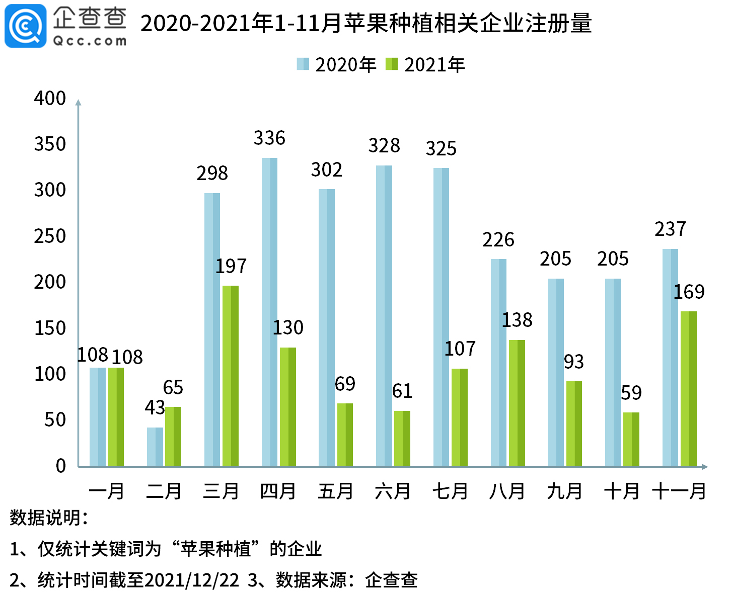 企查查数据显示,今年1-11月共新增1196家苹果种植相关企业,同比下降54%。一月相关企业注册量达108家,与去年同期持平。三月相关企业注册量为今年最高,共新增197家,环比增长203%,同比下降34%。11月共新增169家,环比增长186%,同比下降29%。