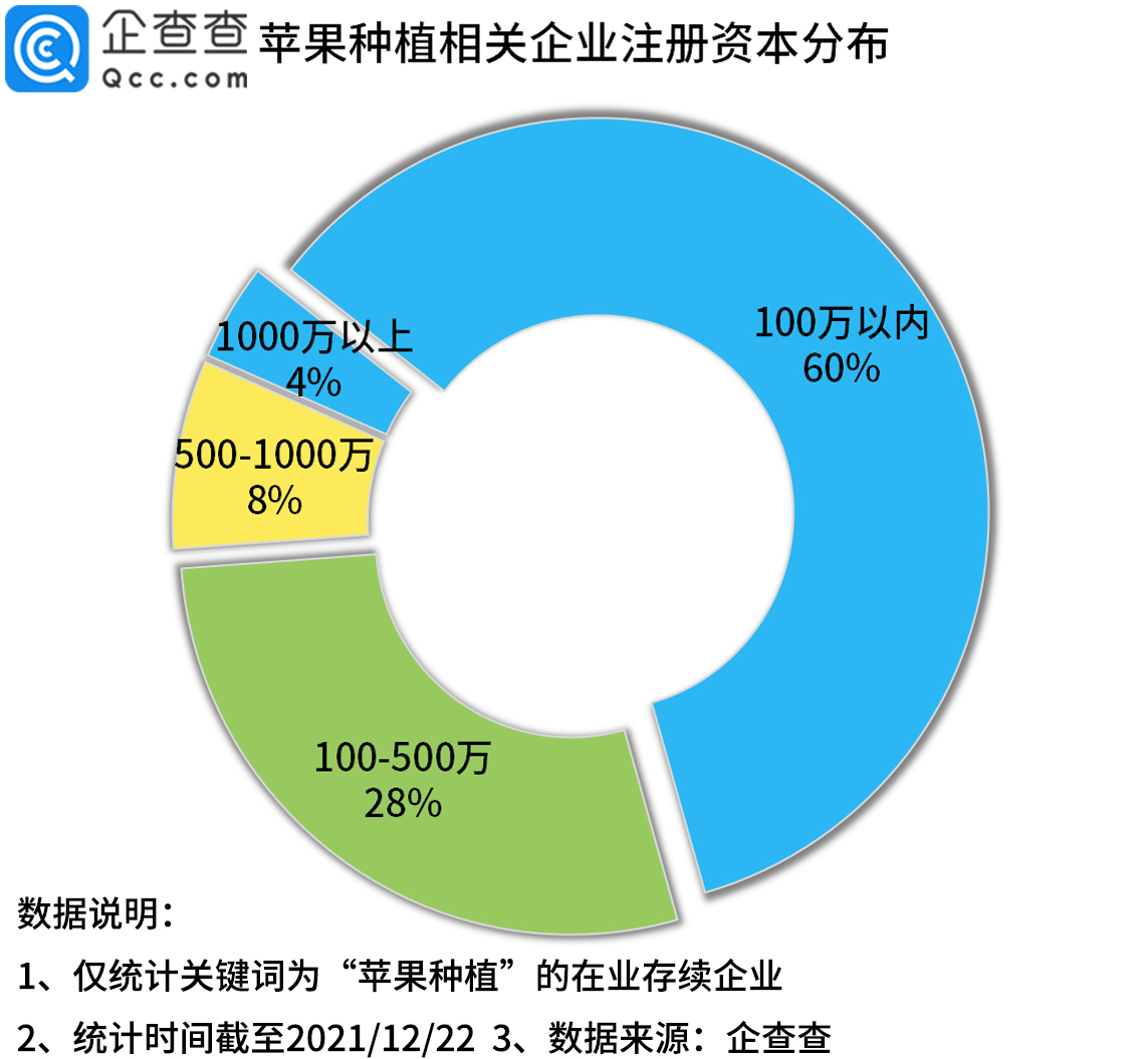 从注册资本上看,企查查数据显示,我国近九成的苹果种植相关企业注册资本在500万以内,其中注册资本在100万以内的占60%,28%的相关企业注册资本在100-500万。而注册资本在1000万以上的则占总量的4%。