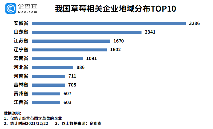 企查查数据显示,从区域分布来看,安徽以3286家草莓相关企业排名第一。山东。江苏分别有草莓相关企业2341家、1670家,排名前三。此后依次为辽宁省、云南省、河北省等。