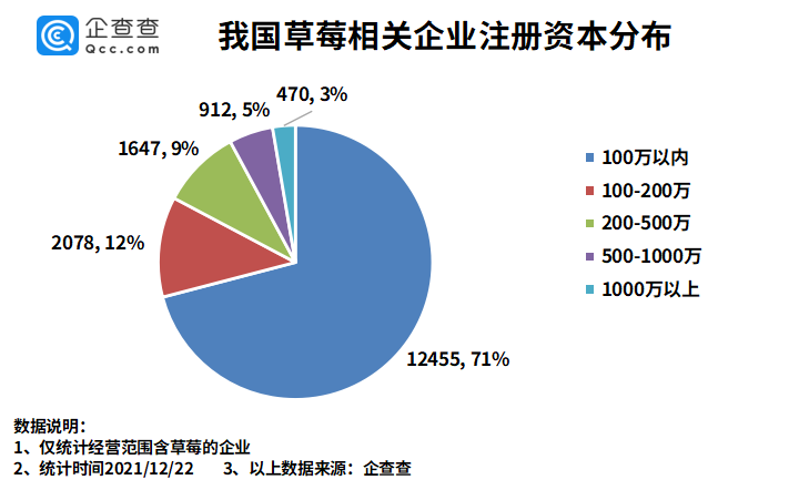 草莓相关企业注册资本分布:100万以内的占比71%