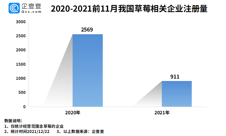 企查查数据显示,2021年前11月,我国新增草莓相关企业911家,同比减少64.54%。2020年前11月,我国新增草莓相关企业2569家。