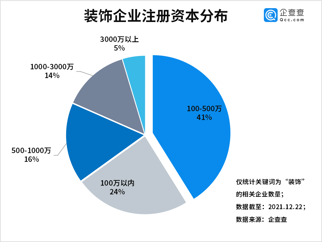企查查数据显示,从注册资本来看,装饰相关企业普遍为中小企业,注册资本集中在100-500万元的占41%,注册资本在100万元以内和500-1000万元的分别有24%和16%。