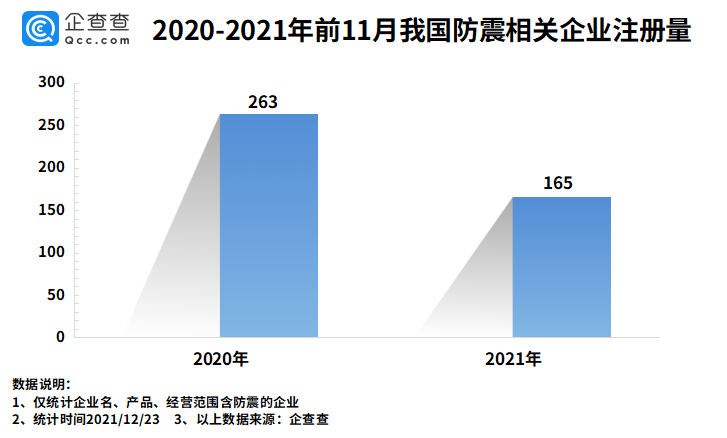 企查查数据显示,2021年前11月,我国新增防震相关企业165家,同比减少37.26%。2020年前11月,我国新增防震相关企业263家。