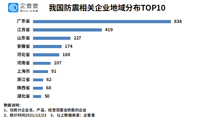 企查查数据显示,从区域分布来看,广东以838家防震相关企业排名第一。江苏、山东分别有419家、227家防震相关企业,排名前三。此后依次为安徽省、河北省、河南省等。