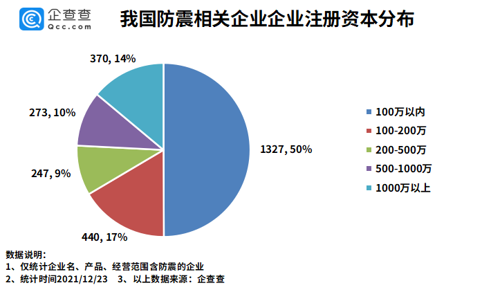 防震相关企业注册资本分布:100万以内的占比50%