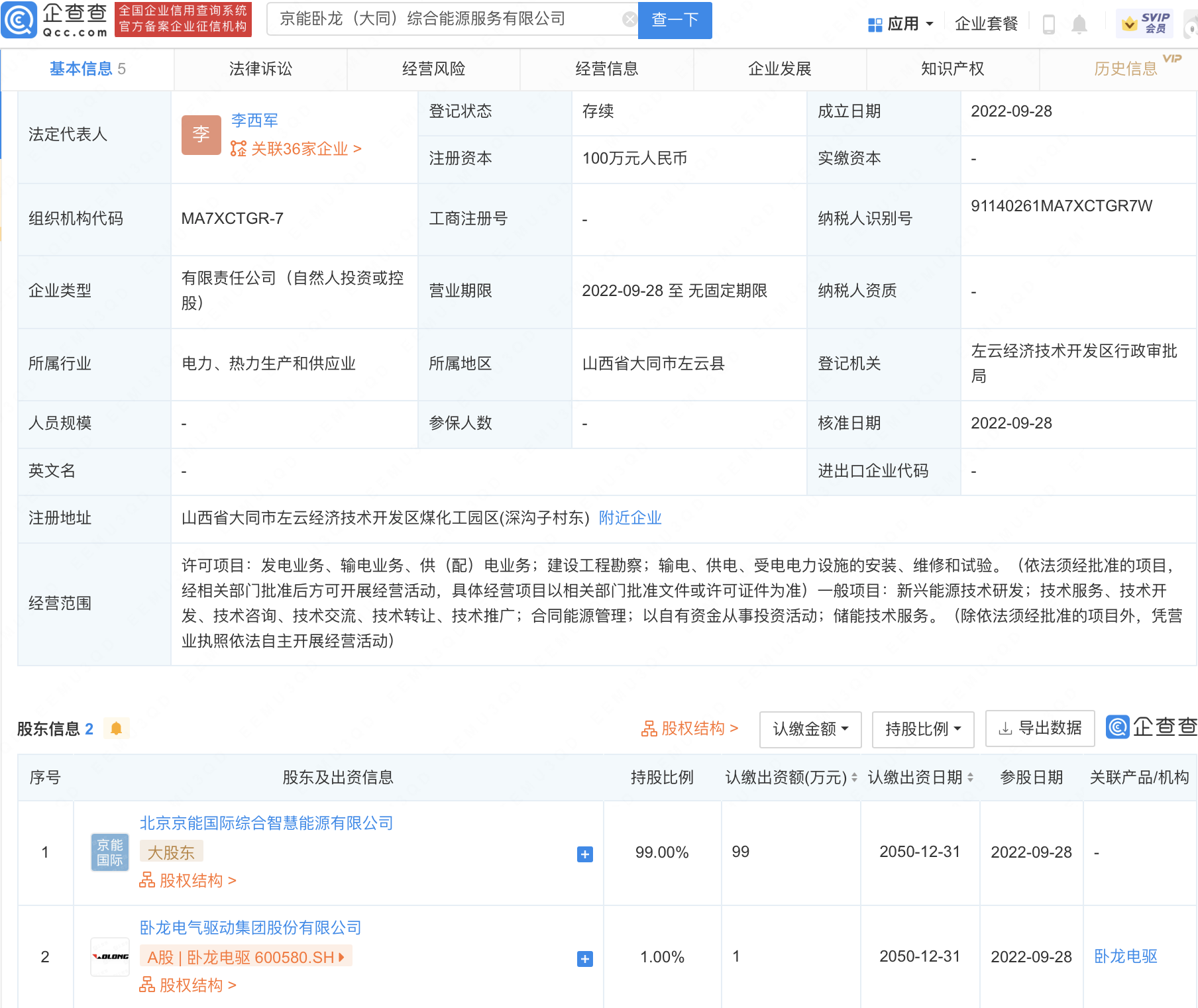 企查查APP显示,近日,京能卧龙(大同)综合能源服务有限公司成立,法定代表人为李西军,注册资本100万元人民币,经营范围包含:新兴能源技术研发;合同能源管理;以自有资金从事投资活动;储能技术服务等。企查查股权穿透显示,该公司由北京京能国际综合智慧能源有限公司、卧龙电驱(600580)共同持股。