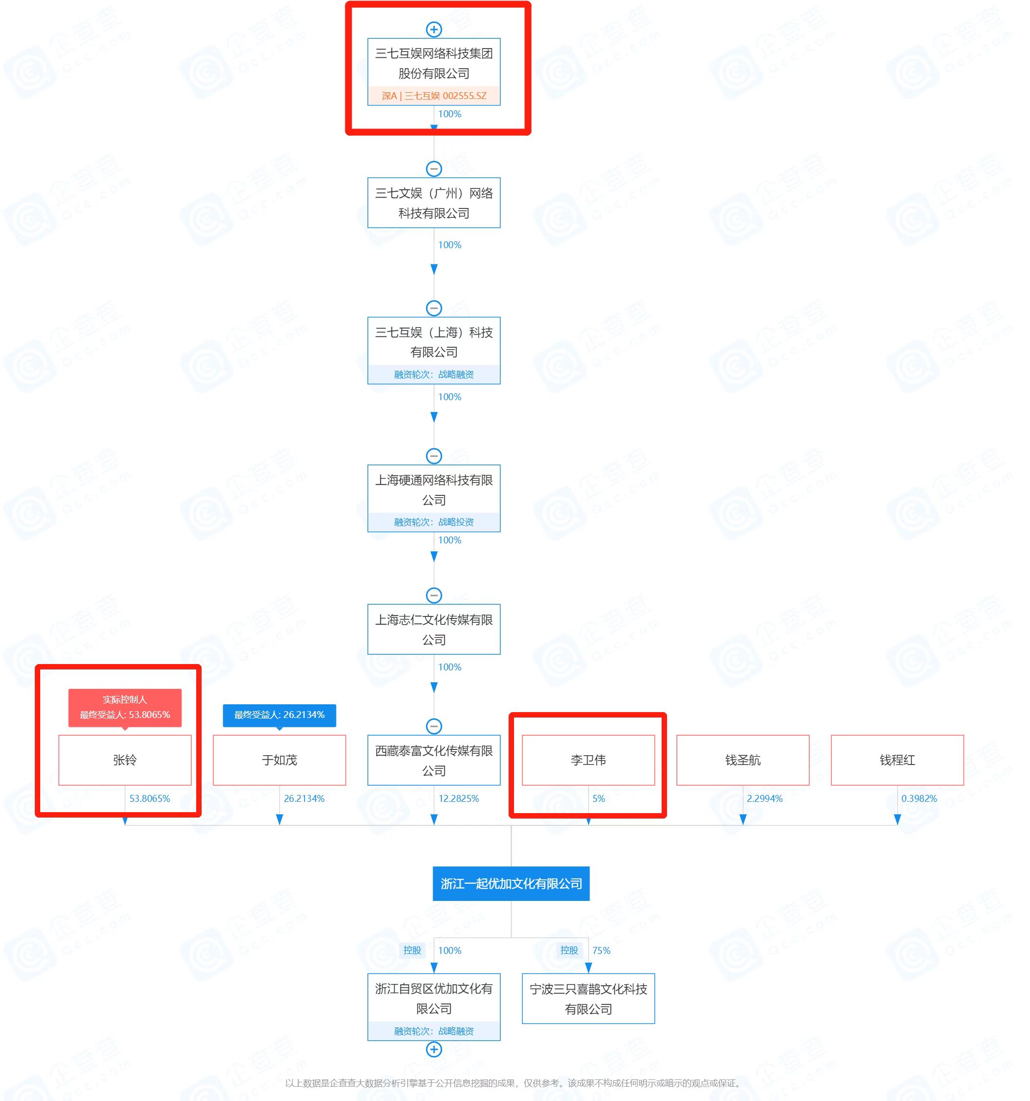 企查查股权穿透显示,张铃持有该公司约53.8%股份,为公司最终受益人。值得关注的是,三七互娱网络科技集团股份有限公司与三七互娱创始人李卫伟均持有该公司股份,共计约17.28%股份。